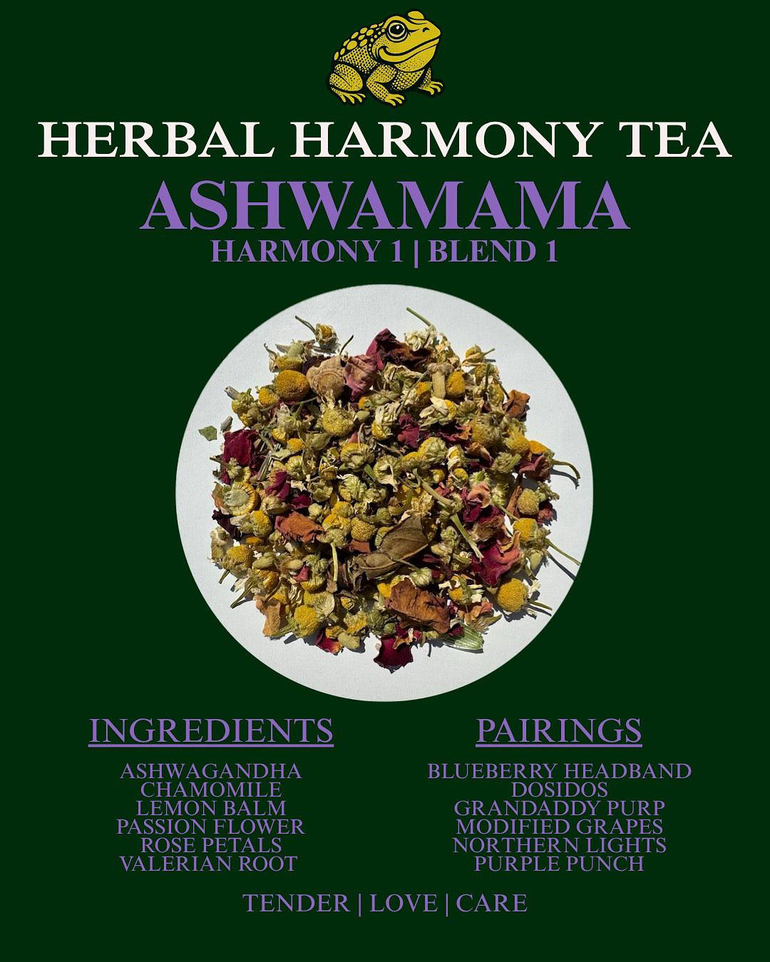 💐 Introducing Ashwamama — our very first blend, and yes, Herbie made it himself (with his three tiny toad hands). 🌹💐🌹